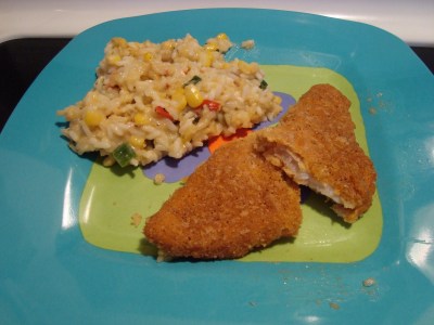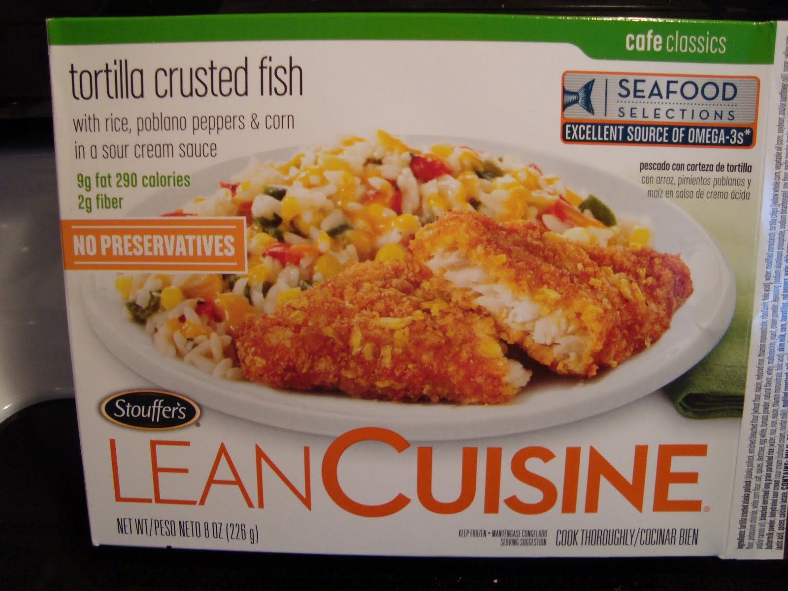 In the past, I’ve found their food to be a bit bland, found their portions small, and found myself hungry again an hour later.  However, after being bombarded with all of their ads about new recipes and “spa menus” and satisfaction, I thought I would give it another try.  Today’s attempt was the tortilla crusted fish, served with rice, poblano peppers, and corn in a sour cream sauce.  After plating my entree (I make it a point to never eat directly from the microwave tray, and apparently the people at Stouffer’s agree), I was pleasantly surprised to find that my meal fairly closely resembled the photo on the box.