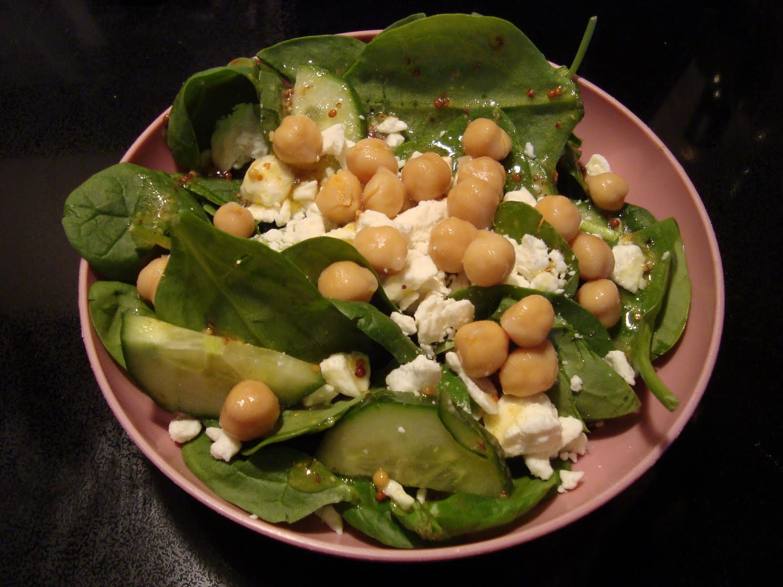 I ate it with a spinach salad topped with cucumber, feta, chickpeas and a homemade dressing.  If you still buy your dressing from the store, you’re really missing out.  It’s so simple and delicious and fresh (yes, I use that word a lot) to make dressing at home and you should definitely give it a try.  Today, I had a lovely mustard dressing, made by whisking together the following: