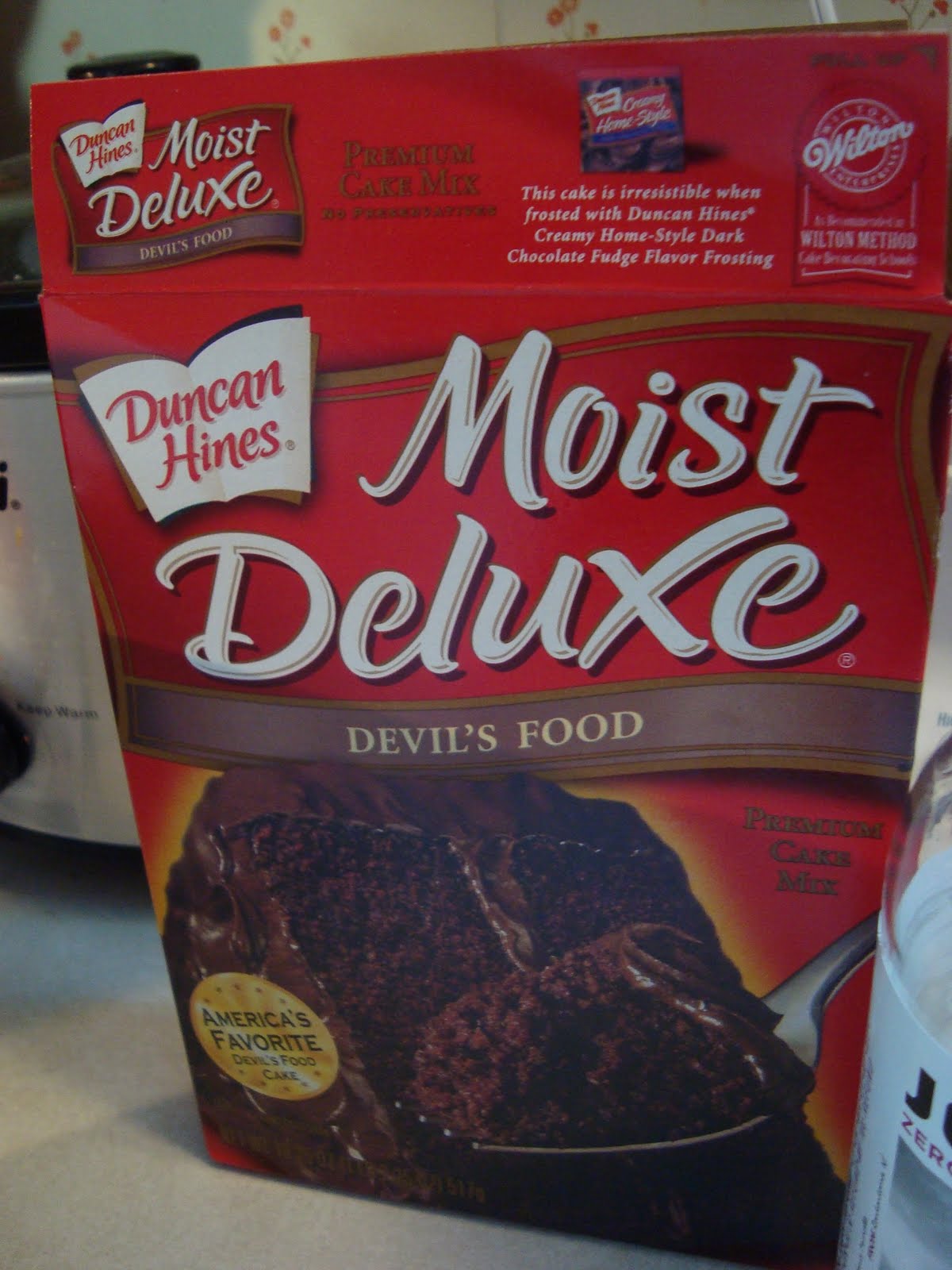 One box of cake mix.  I chose Devil’s Food, because it’s decadent.