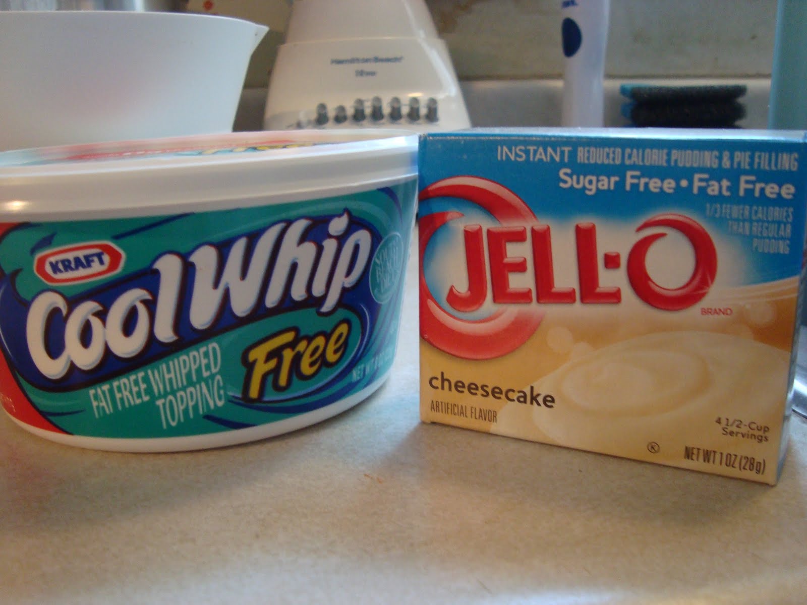 One container of Fat Free Cool Whip (thawed) and one box of Sugar Free/ Fat Free pudding mix.  My choice was Cheesecake flavor, for the obvious reason of deliciousness.
