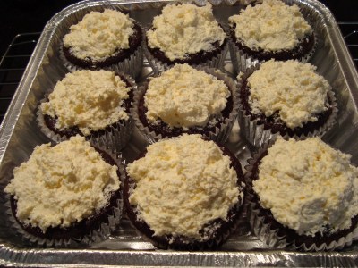 While these little beauties are baking, whisk together the Cool Whip and the pudding mix.  It will be a little thick, so you will probably need an icing spatula to spread it on the cupcakes.  Also, since it’s made primarily from Cool Whip, I would recommend storing excess icing in the fridge.  When you’re finished, they will look a little something like this:
