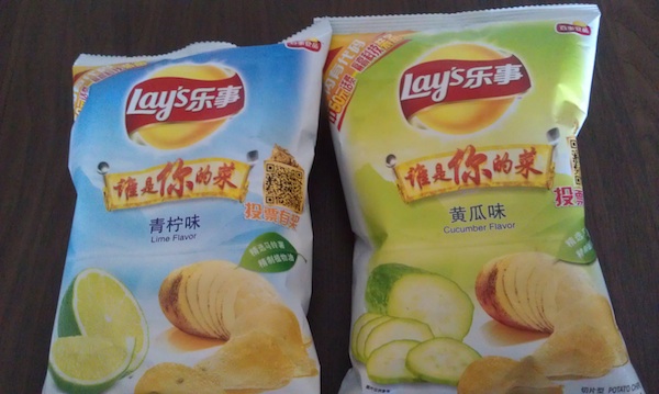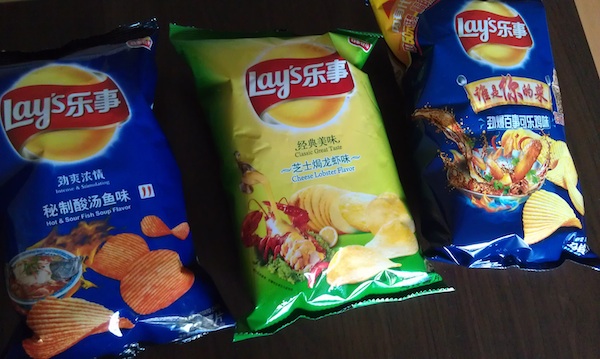 A few months ago in the US, people were going crazy for 3 flavors of Lay’s chips pitted against each other in a contest for permanent production status. In reviewing the Chicken & Waffles, Sriracha, and Cheesy Garlic Bread chips, The New York Post said that they “were about as far away from the classic BBQ, Sour Cream & Onion and Salt & Vinegar varieties than one could imagine.” The good people at the NYP have obviously never been to China.
