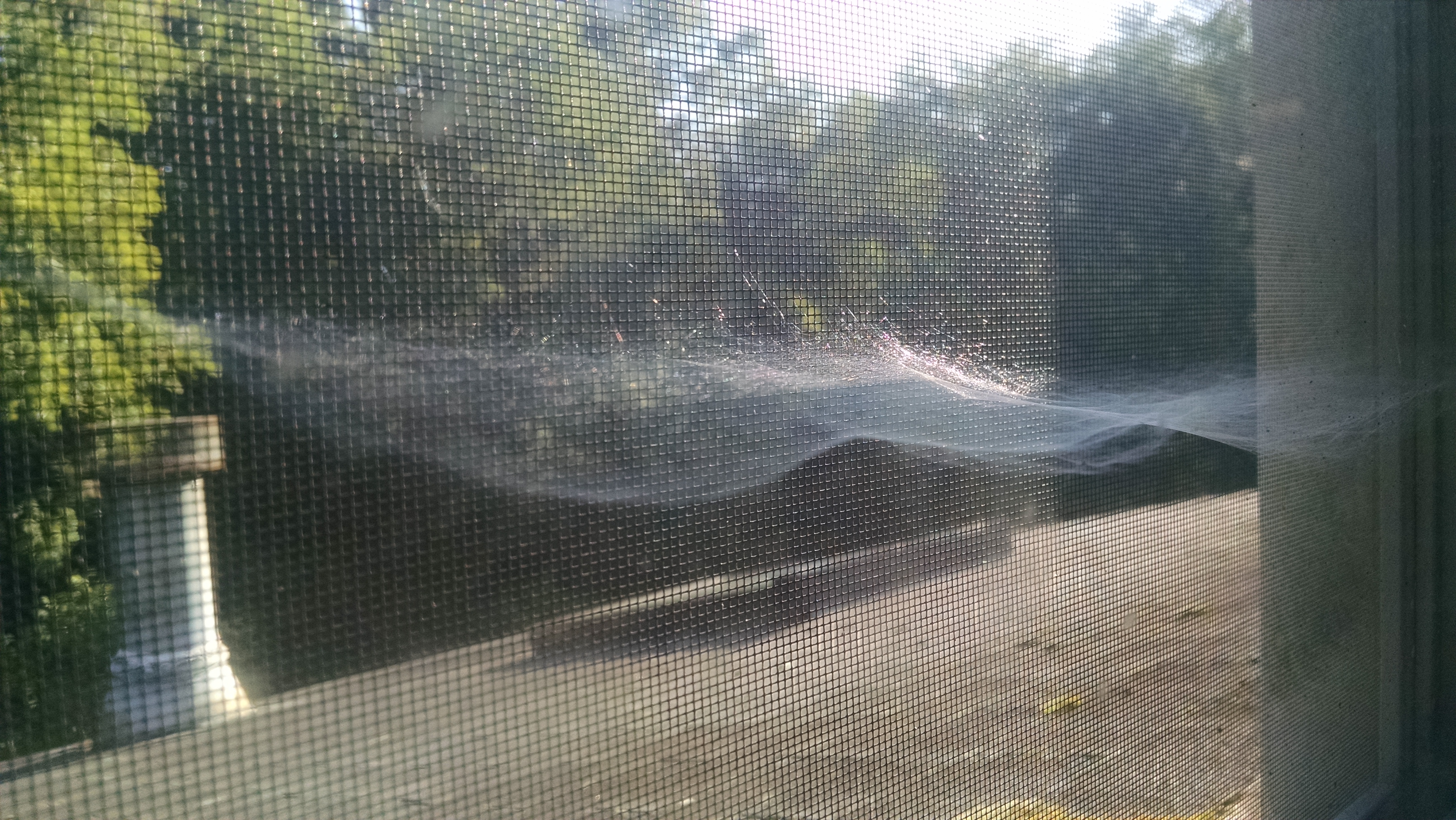 It’s generally just an offhand comment, a quick “Good morning, window spider!” as I fold sheets and fluff pillows. (I have yet to come up with a better name than that, but often simple observation just feels right.) Sometimes I’ll remark on the fact that she continues to grow, despite me never seeing her actually catch anything to eat. This morning I noted that she seemed to have weathered last night’s storm rather expertly, already adding a secondary layer under her net where holes wore through.