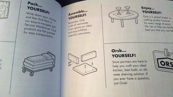 Before I get into the finer points of the plot, I think it’s important to talk about the stunning design of this book. It’s larger format, the exact dimensions of an Ikea catalogue, and organized like one as well. The inside front cover has a map of the store, followed by a welcome page and how-to guide for shopping at Orsk. There’s a detailed home delivery order form that slyly and seamlessly integrates the copyright and publisher information.