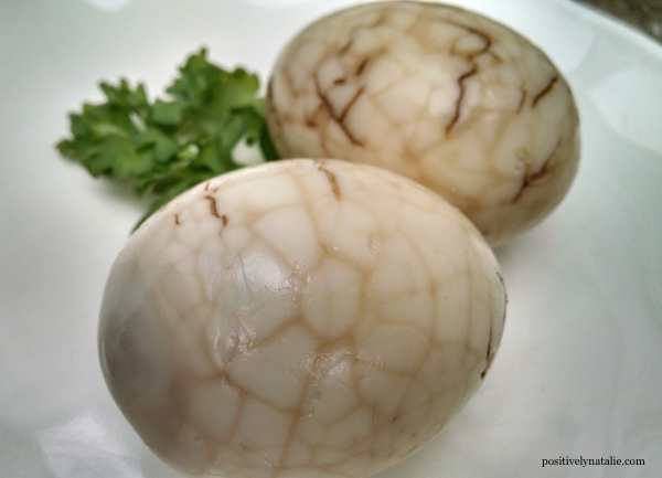 I think the flavor stands out enough on its own, but if you wanted to get a little fancier with your brunch presentation tea eggs also taste great with a little dollop of sriracha mayonnaise (1 part sriracha to 3 parts mayo).